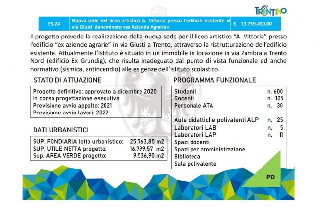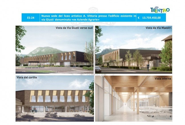 L'altro intervento in materia edilizia scolastica è quello che coinvolge il liceo artistico Vittoria: l'investimento è di 13,7 milioni di euro. La nuova sede è prevista alle "ex aziende agrarie" in via Giusti a Trento.