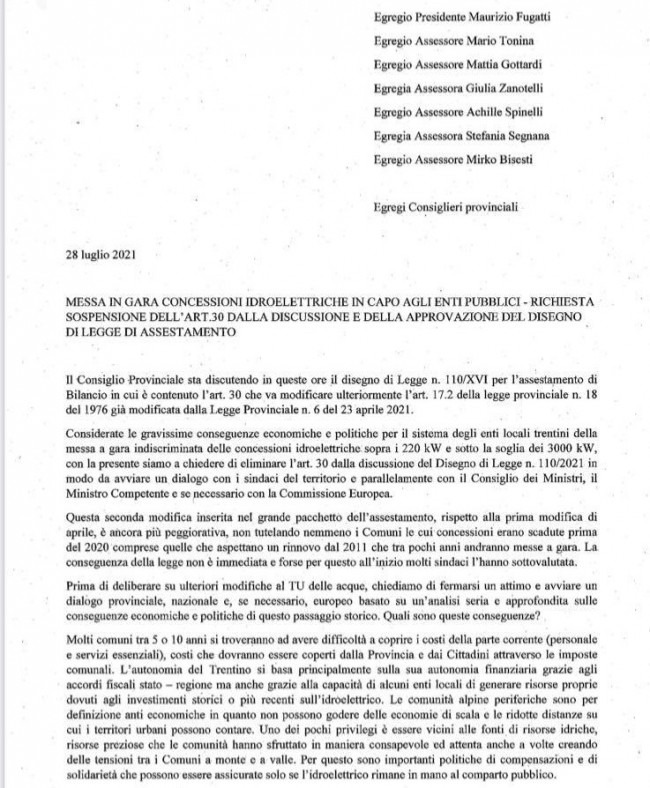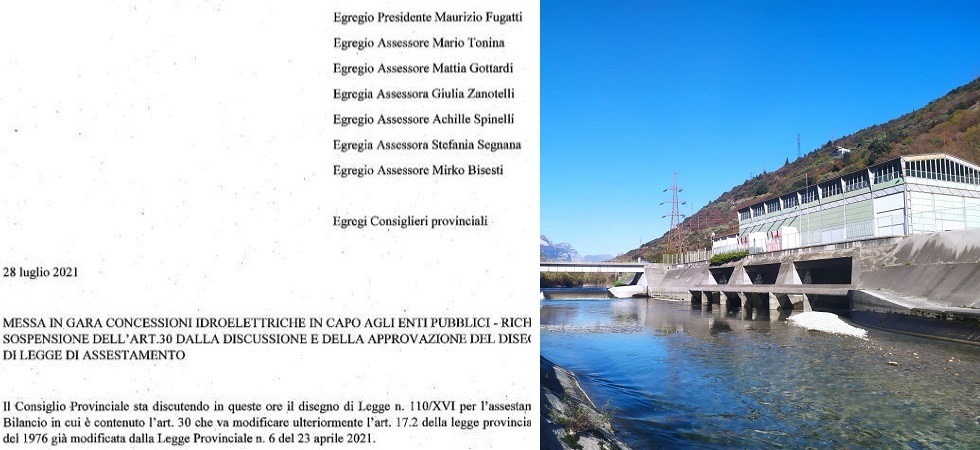 La lettera di 43 Comuni alla Giunta: ''Sospendente norma sulle concessioni idroelettriche. Si rischia un grande danno per il territorio''