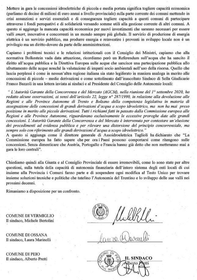 TRENTO. "Considerate le gravissime conseguenze economiche e politiche per il sistema degli enti locali trentini della messa a gara indiscriminata delle concessioni, siamo a chiedere di eliminare l'articolo 30 della discussione del Disegno di legge in modo da avviare un dialogo con i sindaci del territorio e parallelamente con il Consiglio dei ministri, il ministro competente e se necessario con la Commissione europea". Questa la lettera firmata (in fondo in forma integrale) da 43 sindaci del Trentino e inviata alla Giunta provinciale.