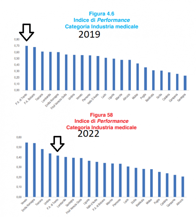 L'Indice di Performance per la categoria Industria medicale nel 2019 il Trentino era al 1° posto mentre oggi è 5° dietro a Veneto, Emilia Romagna, Toscana e Umbria.