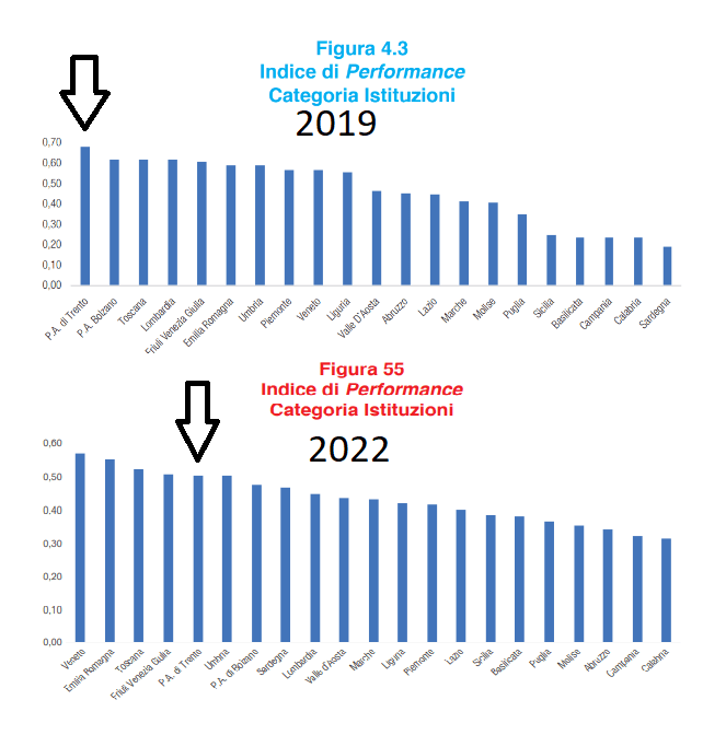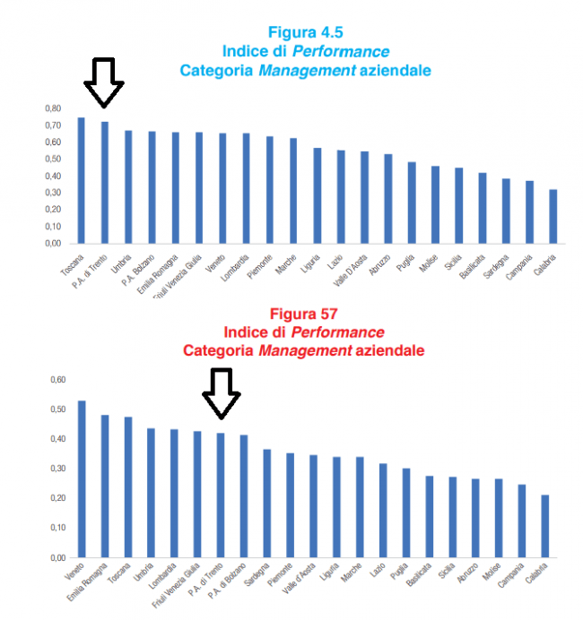 L'Indice di Performance per la categoria Management aziendale nel 2019 il Trentino era 2° dietro alla Toscana mentre oggi è 7° dietro a Veneto, Emilia Romagna, Toscana, Umbria, Lombardia e Friuli Venezia Giulia