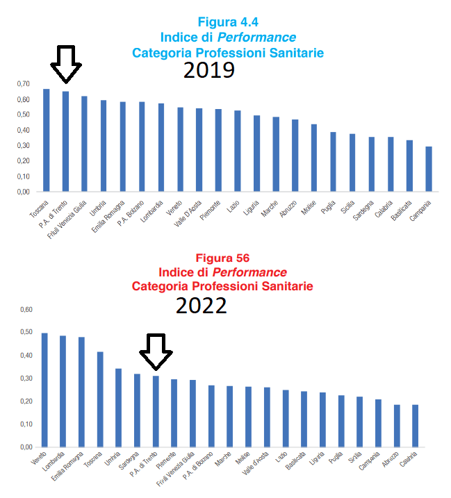L'Indice di Performance per la categoria Professioni Sanitarie nel 2019 il Trentino era 2° dietro alla Toscana mentre oggi è 7° dietro a Veneto, Lombardia, Emilia Romagna, Toscana, Umbria, Sardegna.