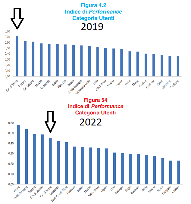 L'Indice di Performance per la categoria Utenti vedeva nel 2019 la Provincia di Trento al 1° posto mentre oggi è al 5° posto dietro a Veneto, Emilia Romagna, Toscana e Provincia di Bolzano