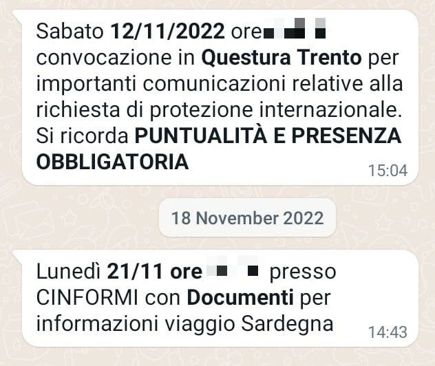TRENTO. “Convocazione in Questura Trento per importanti comunicazioni relative alla richiesta di protezione internazionale. Si ricorda puntualità e presenza obbligatoria”, è questo il messaggio che Karim (il nome è di fantasia) ha ricevuto lo scorso 9 novembre tramite Whatsapp. Karim è uno dei tanti richiedenti asilo che hanno presentato la domanda in Trentino ma che finora avevano conosciuto solo la strada perché la Provincia di Trento non aveva posti per accoglierli.