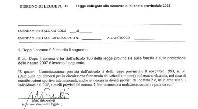 TRENTO. Via libera a moto e macchine (mezzi a motore) sulle strade forestali ma anche lungo le mulattiere oppure sulle piste da sci o nei sentieri? E' quanto prevede un emendamento alla manovra di Bilancio, che vede come primo firmatario il governatore Fugatti.