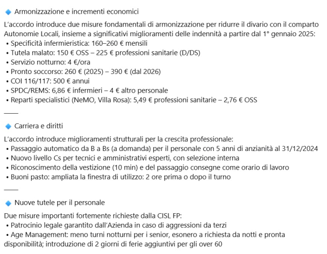 Particolare attenzione riservata al personale del Pronto Soccorso, a chi effettua turni notturni e quelli che operano in strutture periferiche e particolarmente disagiate; incremento delle risorse per la retribuzione accessoria, con particolare attenzione alle responsabilità e ai servizi più complessi e l'avvio di un percorso di armonizzazione economica per tutto il personale rispetto al comparto delle autonomie locali.