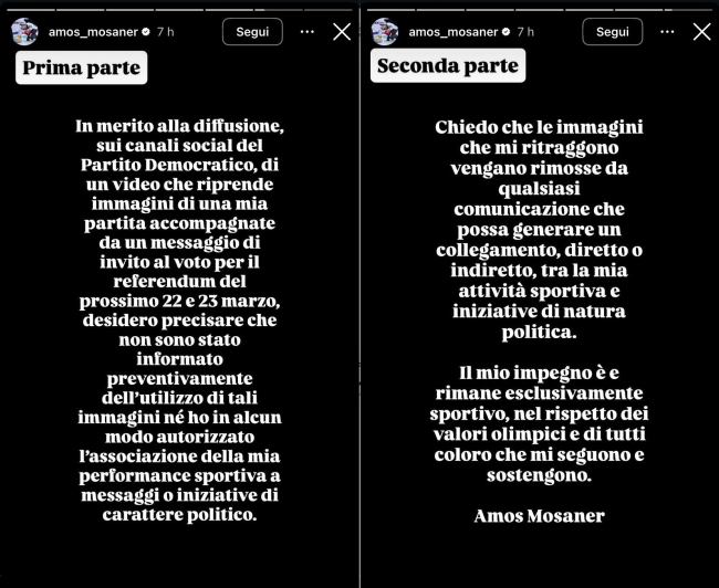 Mosaner, quindi, chiede che le immagini che lo ritraggono “vengano rimosse da qualsiasi comunicazione che possa generare un collegamento, diretto o indiretto, tra la mia attività sportiva e iniziative di natura politica. Il mio impegno è e rimane esclusivamente sportivo, nel rispetto dei valori olimpici e di tutti coloro che mi seguono e mi sostengono”.