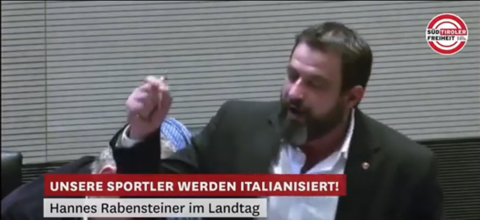Sempre per un contesto. Il consigliere provinciale Rabensteiner fa parte della Süd-Tiroler Freiheit. Il partito di Eva Klotz, per fare una sintesi estrema. Quel partito che Wikipedia descrive come “alleanza liberale-patriottica che reclama il diritto all'autodeterminazione per il Popolo Sudtirolese»: si prefigge pertanto il conseguimento dell'indipendenza dell'Alto Adige dall'Italia con successiva riannessione allo Stato Federato del Tirolo, "sanando" così la cessione effettuata dall'impero austro-ungarico alla fine della prima guerra mondiale”.