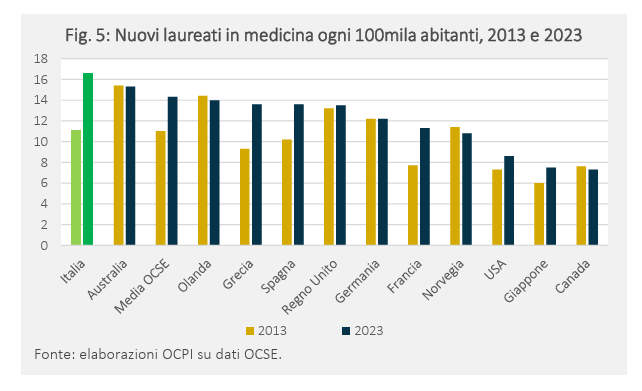 Insomma i medici ci sono in Italia ma non scelgono il Trentino Alto Adige. Il problema, semmai, per i medici di casa nostra è che sono tra i più anziani di tutti. Il 44% dei medici italiani è over 55 il dato più alto di tutti i Paesi Ocse. Ma i nuovi laureati arrivano visto che negli ultimi 10 anni c'è stato un vero e proprio booster al sistema e oggi i laureati risultano essere 16,6 ogni 100mila abitanti, sopra la media Ocse (che è a 14,3 ogni 100mila abitanti). Gli altri Paesi europei hanno valori compresi tra 11 e 13, mentre Usa, Giappone e Canada sono sotto la soglia dei 9 laureati ogni 100mila abitanti.
