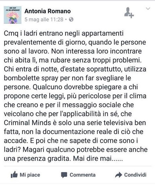 Ecco il testo completo del post della consigliera comunale: “Cmq i ladri entrano negli appartamenti prevalentemente di giorno, quando le persone sono al lavoro. Non interessa loro incontrare chi abita lì, ma rubare senza troppi problemi. Chi entra di notte, d'estate soprattutto, utilizza bombolette spray per non far svegliare le persone. Qualcuno dovrebbe spiegare a chi propone certe leggi, più pericolose per il clima che creano e per il messaggio sociale che veicolano che per l'applicabilità in sé, che Criminal Minds è solo una serie televisiva ben fatta, non la documentazione reale di ciò che accade. E poi che ne sapete di come sono i ladri? Magari qualcuno potrebbe essere anche una presenza gradita. Mai dire mai...".