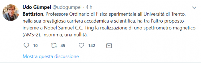 Giornalisti, politici e tanti cittadini. Sono in tanti a difendere l'operato di Roberto Battiston e a criticare la scelta fatta in questi giorni. C'è anche l'ex presidente della Provincia Lorenzo Dellai che Battiston lo conosce bene e spiega: ''La rimozione di Roberto Battiston dalla funzione di Presidente della Agenzia Spaziale Italiana si può spiegare solamente con il clima di ricerca esasperata di occupazione del potere da parte delle forze politiche oggi in maggioranza. Il Presidente Battiston ha svolto il suo compito con competenza e professionalità, portando la ricerca spaziale italiana a livelli di grande efficacia e credibilità internazionale. E sempre con atteggiamenti di serietà e di indiscussa autorevolezza. Ciò ha onorato il Tentino e le sue istituzioni scientifiche, alle quali come noto Battiston è molto legato e che in questi anni hanno visto crescere le opportunità di cooperazione culturale e scientifica con l’Agenzia Spaziale Italiana".