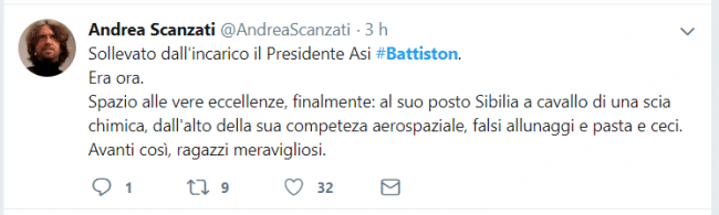 Battiston è finito, suo malgrado, tra l'incudine e il martello di due movimenti politici, Lega e Movimento 5 Stelle, alleati sulla carta, ma sempre alla ricerca di spazi e visibilità per sovrastare l'altro. La manovra di defenestrazione dello scienziato trentino, è stata condotta tutta dalla Lega. Da un lato il sottosegretario Giorgetti, che ha la delega sulle politiche spaziali e aerospaziali, e dall'altro il ministro dell'Istruzione, università e ricerca Marco Bussetti (sempre di area leghista). E non è un caso il Tweet del suo braccio destro, il viceministro dell’Istruzione Lorenzo Fioramonti del Movimento 5 Stelle che ha scritto: “Ho appreso anche io questa notizia dai social network stamattina. Non sarebbe male se decisioni che attengono allo sviluppo ed alla leadership del sistema di ricerca in Italia si condividessero anche con il vice ministro, visto che si è occupato di ricerca scientifica per anni”.