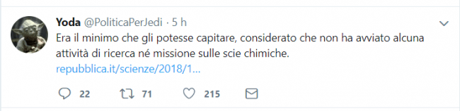TRENTO. Una prova muscolare della Lega capace, ancora una volta, di mettere in scacco i colleghi di governo del Movimento 5 Stelle. Un'operazione di spoils system in piena regola, che crea un pericoloso precedente, perché nel mondo della ricerca e dell'università, in Italia, manca solo che con il cambiare dei governi vengano riviste cariche e ruoli per affossare definitivamente competenze e qualità. Una decisione, infine, che sta scatenando una reazione anche di popolo con prese di posizione pubbliche di giornalisti (Udo Gumpel), ''guru'' della rete (Andrea Scanzati e Yoda-PoliticaPerJedi che ironizza: ''Era il minimo che gli potesse capitare, considerato che non ha avviato alcuna attività di ricerca né missione sulle scie chimiche'') e semplici cittadini che hanno anche lanciato una raccolta firme per chiedere al Governo di ripensarci (QUI PER SOSTENERLO).