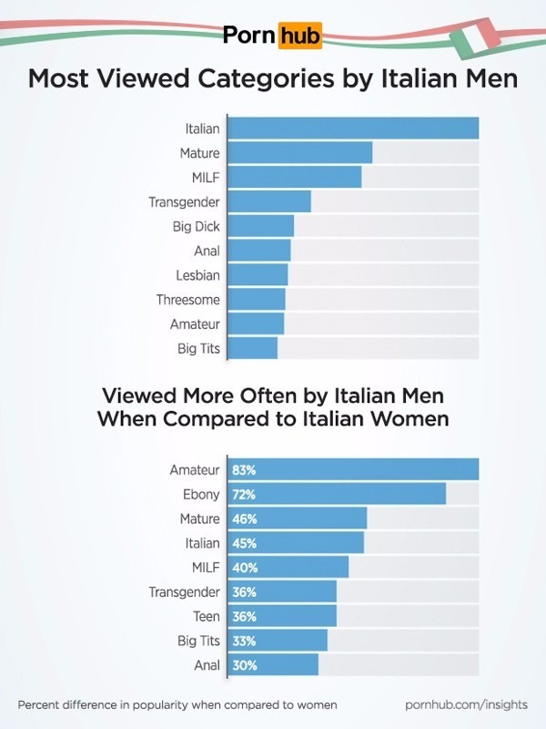 Le parole chiave più cercate in Italia sono 'Milf' e 'Italian' nelle varie forme, mentre la permanenza media sul sito è di circa 8 minuti e 37 secondi. Le donne italiane che accedono al portale sono il 23% del totale, mentre il 27% sono, in teoria, maggiorenni tra i 18 e i 24 anni e tra i 25 e 34 anni. Spazio quindi al gruppo di età tra i 35-44 e 45-54, che rispettivamente rappresentano il 19% e 13%.