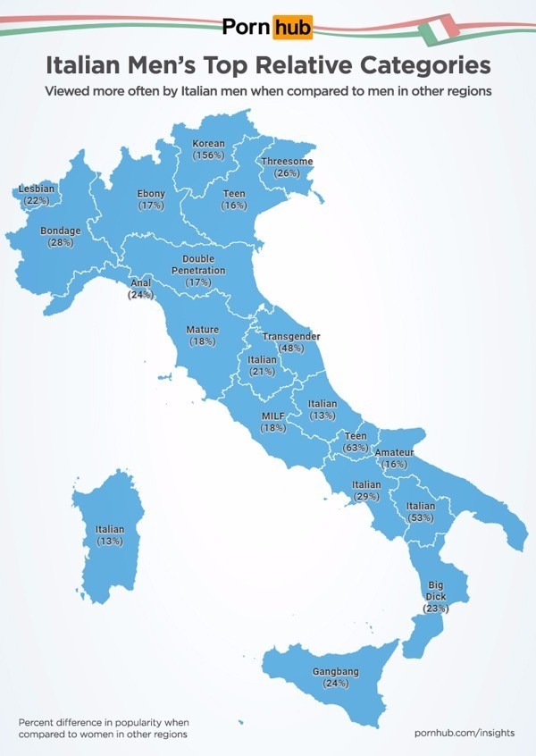 I dati analizzano le ricerche di uomini e donne, divise per regione. Pornhub è il più famoso sito al mondo di video porno e da anni è particolarmente attento alla sua immagine, che cura tramite pubblicità spesso molto apprezzate e un’intensa attività di analisi del grande traffico di dati che genera.