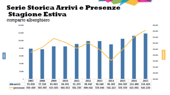 Una stagione estiva da incorniciare in grado di registrare ottime performance nel comparto alberghiero e in quello extralberghiero certificato. Segno 'più' per arrivi (7,17%) e presenze (4,56%) rispetto all'estate 2016. Brilla in particolare l’aumento della clientela italiana per una crescita dell’8,5% degli arrivi e del 5,2% delle presenze.