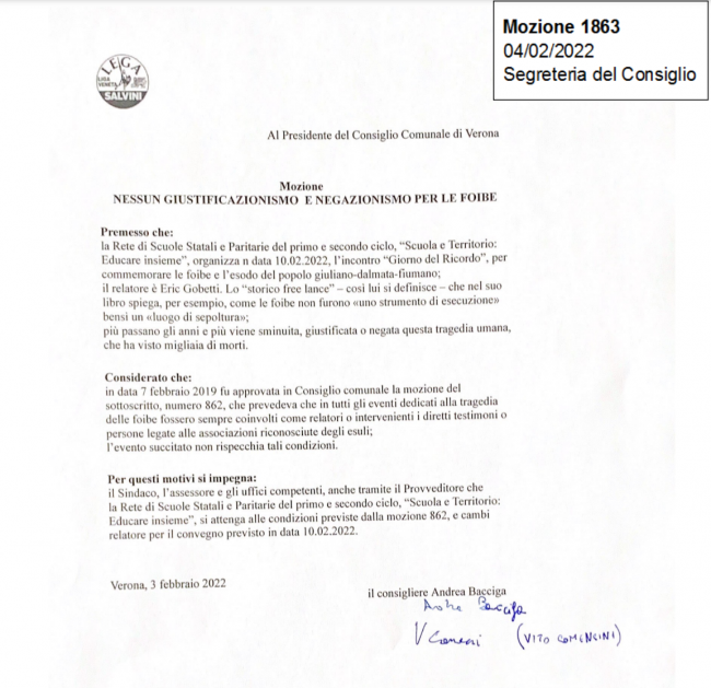 Ad imporre il cambio di rotta è stata una mozione del consigliere comunale della Lega Nord Andrea Bacciga, depositata il 3 febbraio. Intitolato “Nessun giustificazionismo o negazionismo per le foibe”, il documento invitava la giunta – “considerato che in data 7 febbraio 2019 fu approvata in Consiglio comunale la mozione del sottoscritto, numero 862, che prevedeva che in tutti gli eventi dedicati alla tragedia delle foibe fossero sempre coinvolti come relatori o intervenienti i diretti testimoni o persone legate alle associazioni riconosciute dagli esuli – a cambiare relatore. Soluzione scartata, infine, a favore della partecipazione all’incontro – secondo le parole dello stesso Bacciga sui social – di un “contradditorio doveroso”.
