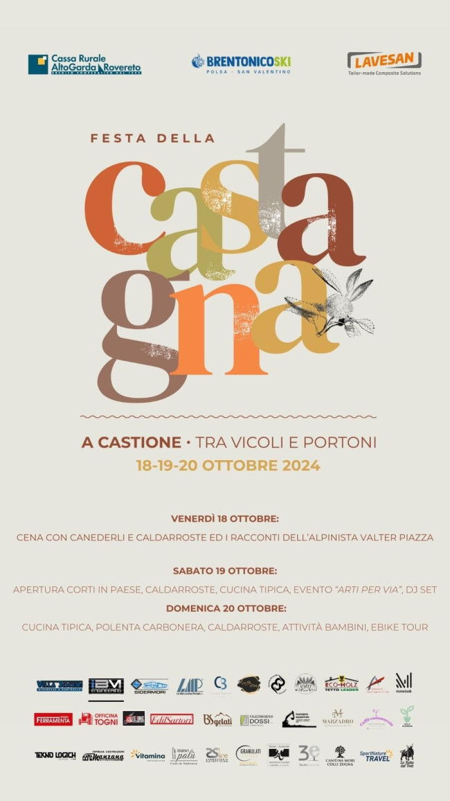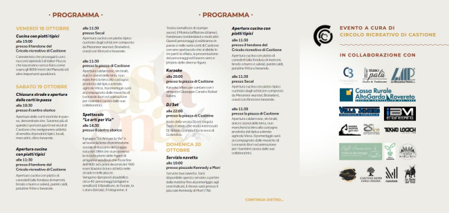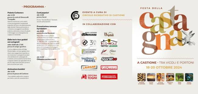Ma sono tante le iniziative nei vicoli e nei portoni del borgo con vari momenti clou: la cena con canederli e caldarroste e i racconti dell'alpinista Valter Piazza (venerdì 18 ottobre), l'apertura delle corti in paese, caldarroste, cucina tipica l'evento "Arti per via dj set" (sabato 19 ottobre) e cucina tipica, polenta carbonera, caldarroste, attività per bambini e e-bike tour (domenica 20 ottobre). Un evento supportato da diverse realtà locali.