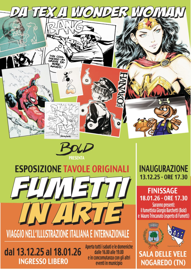 Il concept dell’esposizione è a cura dell’artista Giorgio Barchetti, in arte Bold, noto e apprezzato fumettista italiano che coniuga differenti linguaggi, dalla comunicazione visiva tradizionale alle nuove frontiere del digitale, che in questa mostra porta anche cinque opere inedite e di grandi dimensioni, dipinte ad acrilico. Un’artista completo, capace di fondere creatività, passione e competenza in un’esperienza espositiva coinvolgente e accessibile a tutti.