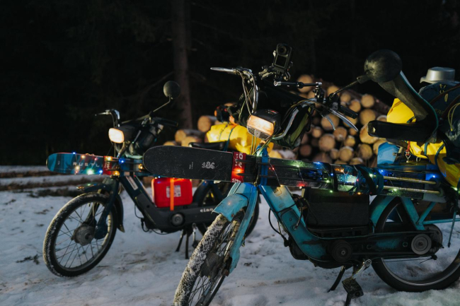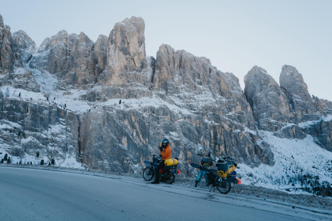 Marco, fotografo “d’avventura” abituato a scenari outdoor mozzafiato, e Matteo, giovane ingegnere che ha rimesso in sesto i due Ciao, hanno replicato un’impresa già riuscita lo scorso inverno. Un viaggio insieme all'amico Filippo Bellisola, percorrendo le curve dei passi alpini a bordo dei loro mezzi a due ruote diretti a passo Valles (QUI ARTICOLO).