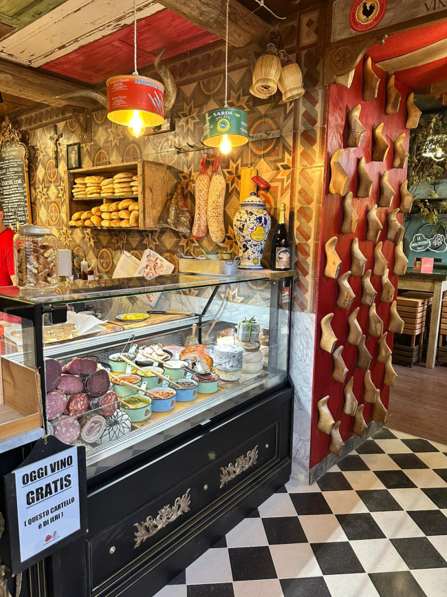 Il locale ricorda una bottega di inizio ’900, fatta di arredi recuperati, materiali vissuti e pezzi unici scelti con cura. Nessun design industriale o contemporaneo, ma un insieme di elementi provenienti da vecchie case coloniche, mercatini e laboratori artigiani, ricomposti grazie alla filosofia del riciclo creativo. Anche i salumi appesi sopra al bancone ricordano le vecchie cantine. Nella sala principale spunta persino un piccolo bosco, ricostruito con piante della casa madre nel Chianti e veri tronchi di quercia.