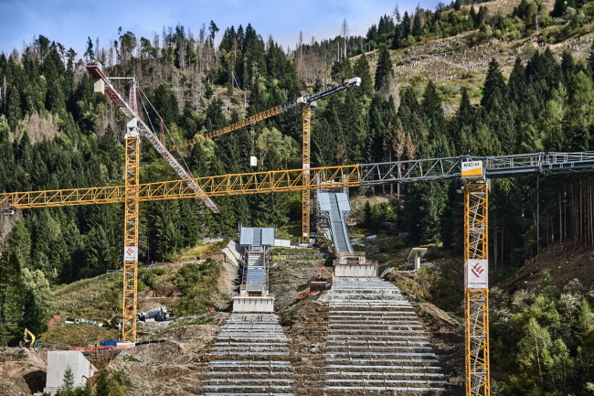 Con uno sbraccio di 78 metri, questa gru ha permesso di raggiungere tutta la parte superiore del cantiere. Nel mezzo, proprio dove finisce la pista dei trampolini di slancio e inizia la pista d’atterraggio, è stata invece in funzione la Liebherr 550 EC-H 20 Litronic, con uno sbraccio di 81,50 metri.