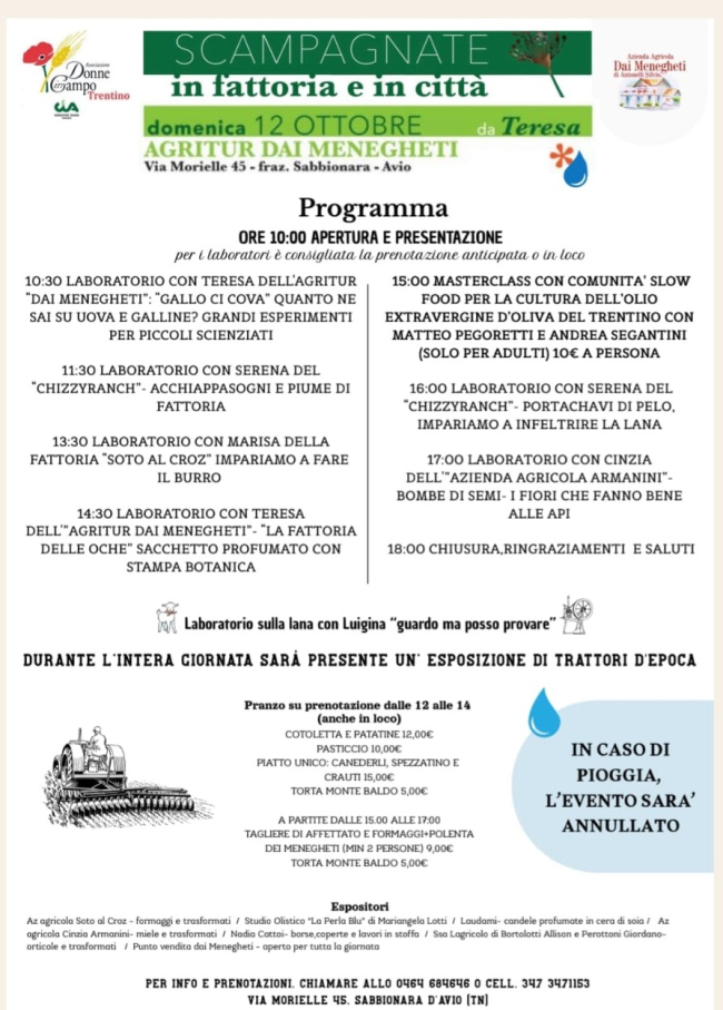 Per tutti vi sarà la possibilità di pranzare in agritur. E' consigliabile prenotare in anticipo sia per i laboratori che per il pranzo, ma sarà possibile prenotare anche al momento, sino ad esaurimento posti. Il numero di telefono da contattare è il 347 - 3471153, anche tramite WhatApp. Tutte le info sulle pagine social dell'agritur "Dai Menegheti" e dell'associazione "Donne in Campo Trentino".