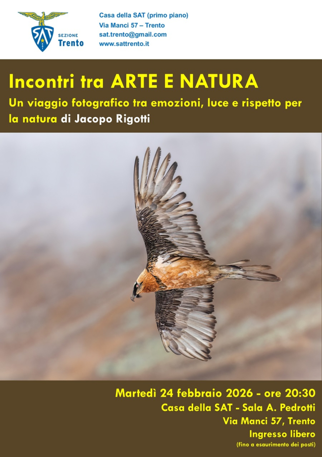 L'appuntamento "Incontro tra arte e natura" è alle 20.30 di martedì 24 febbraio alla Casa della Sat in via Manci.
