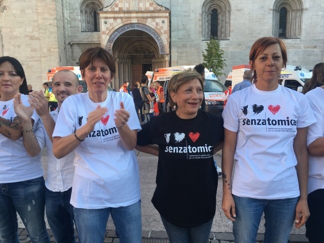 TRENTO. Nel pomeriggio a Trento, in piazza Duomo, si è svolto un flash-mob, partecipato da oltre 50 persone, per promuovere la mostra multimediale ‘Senzatomica- trasformare lo spirito umano per un mondo libero da armi’, che sarà allestita nel Teatro comunale di Pergine Valsugana dal 16 al 30 ottobre 2016. Ad organizzarlo è stato l’Istituto buddista italiano Soka Gakkai (Ibisg), che in Trentino- Alto Adige conta circa 500 membri. Oggi alle 17.30 i 50 partecipanti, vestiti tutti allo stesso modo, con jeans e maglietta con la scritta ‘Senzatomica’, al suono di un fischietto si sono immobilizzati in una posizione che rappresentasse la paura e lo sgomento delle armi nucleari. Questa figura collettiva statica è stata mantenuta per 3 minuti, dopo i quali le persone si sono disposte in una fila parallela alla navata del Duomo, ognuno con una lettera per andare a formare la scritta ‘Senzatomica- trasformare lo spirito umano’.