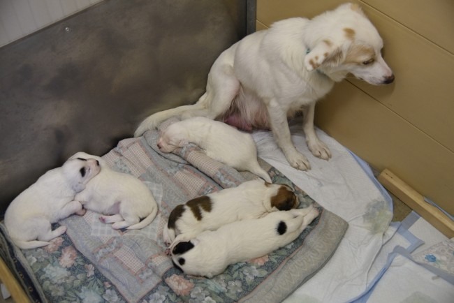 Angelina, cagnetta bianca di media taglia, ha dato alla luce 1 maschio e 4 femmine, Joly, cagnetta bianca e arancio di piccola taglia, 3 maschi e 1 femmina. Sono le due cagnette affidate ad Arcadia e accudite nel canile portate a Rovereto dopo il terremoto del Centro Italia